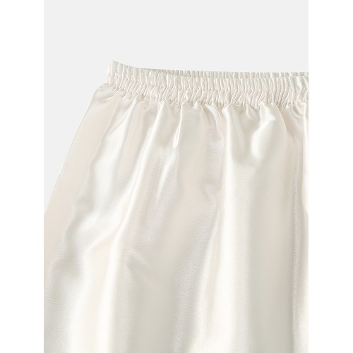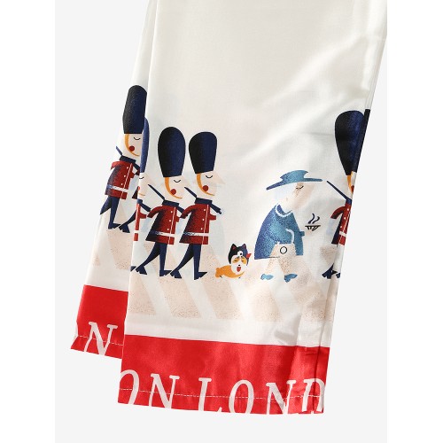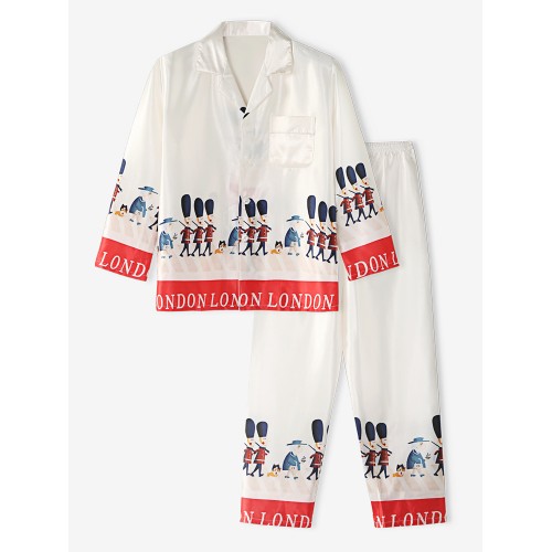 Mens Cartoon Soldier Print Text Tape Faux Silk Home Casual Pajama Set With Flap Pocket